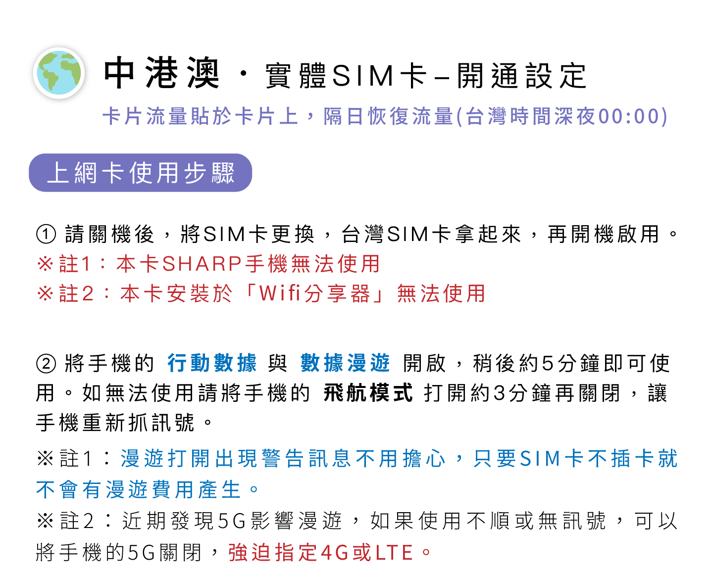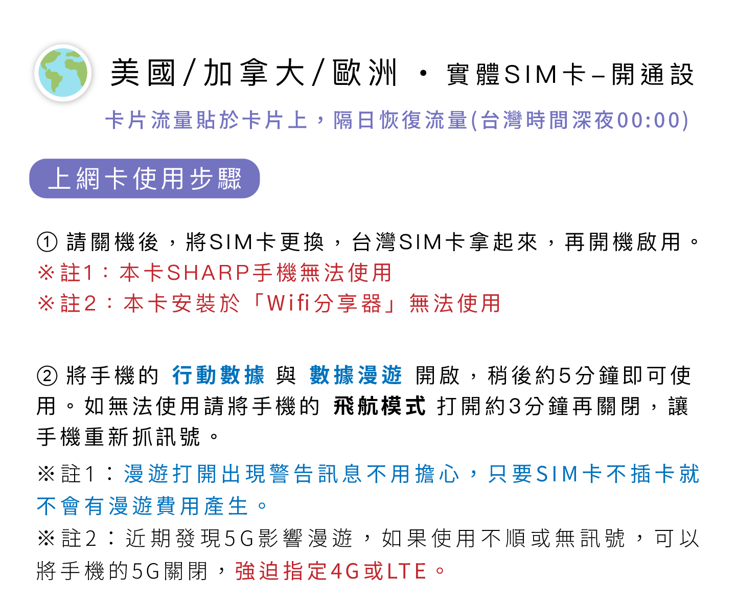 2. 本卡不支援阿拉斯加、國家公園(訊號非常差)、塞班、關島等地。※提醒:在機場轉機處訊號不好是常有情形 (美國機場常有訊號管制) 。